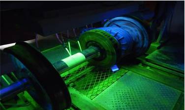 b.红磁粉-成分为三氧化二铁(Fe2O3),呈铁红色粉末状,适用于背景较暗的工件。为了便于现场检验的使用,商品化的磁介质种类很多,除了有黑、红、白磁粉,荧光磁粉,还有球形磁粉(空心、彩色,用于干粉法),还有事先配置好的磁膏、浓缩磁悬液,还有磁悬液喷罐等等,以及为了提高背景深暗或者表面粗糙工件的可检验性而提供的表面增白剂(反差增强剂)等。