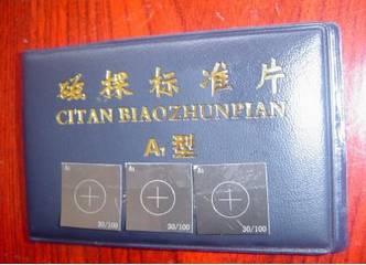 灵敏度试片还可用来检查探伤设备、磁粉、磁悬液的综合使用性能,检查被检工件表面各点磁场的分布规律。灵敏度试片的使用方法是用胶带纸将A型标准试片上开槽的一面紧贴在被检工件清洁的表面上,在对工件和试片进行磁化的同时向试片上喷洒磁悬液,并观察试片上的磁痕。磁化电流恰当,那么试片未刻的槽表面上就会出现清晰的刻槽的磁痕。