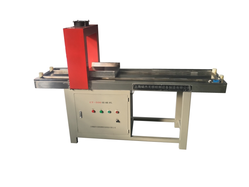 CT-500型退磁机由退磁线圈、输送小车、传输轨道、机械床身以及电源控制系统等组成,是消除工件磁粉检测后工件内部剩磁的一种专用设备,同时,可对工件进行充磁磁化。工件充、退磁均采用交流电,退磁电流大小连续可调;工件退磁采用远离法退磁,退磁后剩磁小于3GS。退磁时,将工件置于退磁小车之上,通过移动小车在轨道上运行,带动工件穿过并远离退磁线圈,达到退磁的目的。